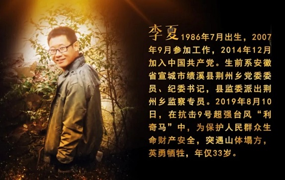 影片中,李夏同志生前是安徽省宣城市績溪縣荊州鄉(xiāng)黨委委員、紀(jì)委書記,縣監(jiān)委派出荊州鄉(xiāng)監(jiān)察專員。他堅(jiān)定理想信念、堅(jiān)守初心使命,十余年來,始終奮戰(zhàn)在脫貧攻堅(jiān)、鄉(xiāng)村振興、正風(fēng)肅紀(jì)第一線。他堅(jiān)持原則、一身正氣,在紀(jì)檢監(jiān)察工作崗位上,敢于較真碰硬,鐵面執(zhí)紀(jì)執(zhí)法,突出整治群眾身邊腐敗和作風(fēng)問題,推動(dòng)全面從嚴(yán)治黨不斷向基層延伸。2019年8月10日,在抗擊臺(tái)風(fēng)利奇馬時(shí)以身殉職,年僅33歲。