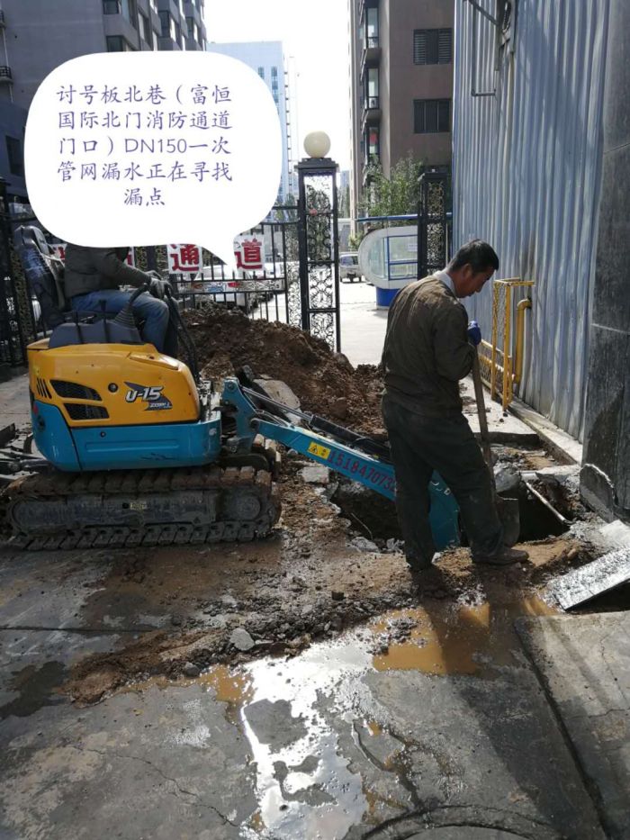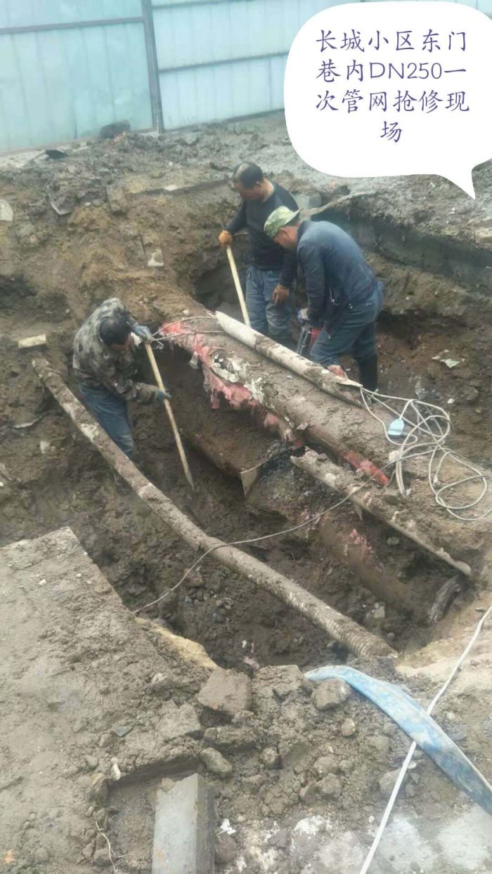 9月29日,管網(wǎng)公司接到辛家營供熱分公司搶修通知,騰飛南路如意廣場(chǎng)環(huán)形路口北側(cè)東綠化帶中發(fā)現(xiàn)一處冒水現(xiàn)象。管網(wǎng)公司領(lǐng)導(dǎo)高度重視,迅即安排人手,查找漏水點(diǎn)。他們憑借豐富的搶修經(jīng)驗(yàn),決定采用十字釘,直架設(shè)于涵管之上,創(chuàng)造人工作業(yè)通道,根據(jù)涵管內(nèi)水流方向判斷,搶修人員在胸腹部綁上滑板及護(hù)具,在DN600熱力管道中向西滑行50米左右,終于發(fā)現(xiàn)了漏水點(diǎn)。為了給供暖投運(yùn)工作贏取時(shí)間,參與搶修的20余人輪班作業(yè),連續(xù)奮戰(zhàn)7個(gè)晝夜,10月6日,圓滿完成搶修任務(wù)。